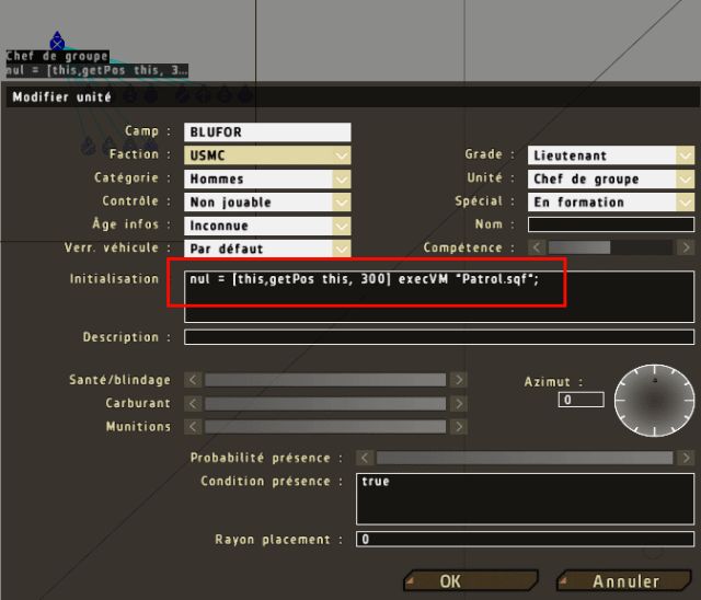 Si vous souhaitez qu'une patrouille parcoure aléatoirement une zone, vous pouvez utiliser le script de patrouille. Il est a placer dans la ligne d'initialisation du chef du groupe.